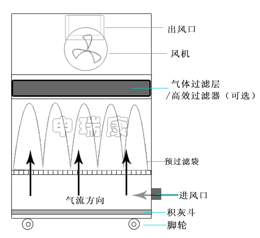 5.倒置進風設計,袋式過濾,大顆粒粉塵會沉降至底部積灰斗,最大程度增加了容塵量。
