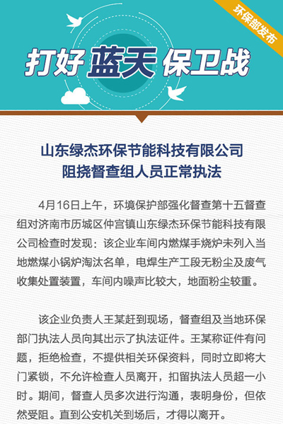 | 4月16日上午,環(huán)保部督查組對山東綠杰環(huán)保節(jié)能科技執(zhí)法受阻一事引起[吊頂式空氣凈化機(jī)]環(huán)保行業(yè)人士一眾關(guān)注;由于該公司電焊生產(chǎn)工段無粉塵及廢氣手機(jī)處置裝置,車間內(nèi)噪聲異常打,地面粉塵嚴(yán)重等各種原因,環(huán)保督察組對其依法采取相應(yīng)措施,貴公司以證件有問題,拒絕檢查,同事扣留執(zhí)法人員超一小時(shí),